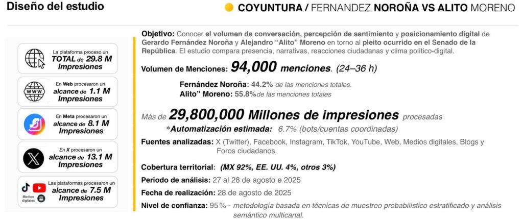 Por: Rodrigo Daniel y Marco González de BOLD El enfrentamiento entre Gerardo Fernández Noroña y Alejandro “Alito” Moreno en el Senado no solo sacudió al recinto legislativo, también encendió las redes sociales y medios como pocas veces ocurre. En apenas 36 horas, el altercado generó 94 mil menciones y casi 30 millones de impresiones. Para […]
